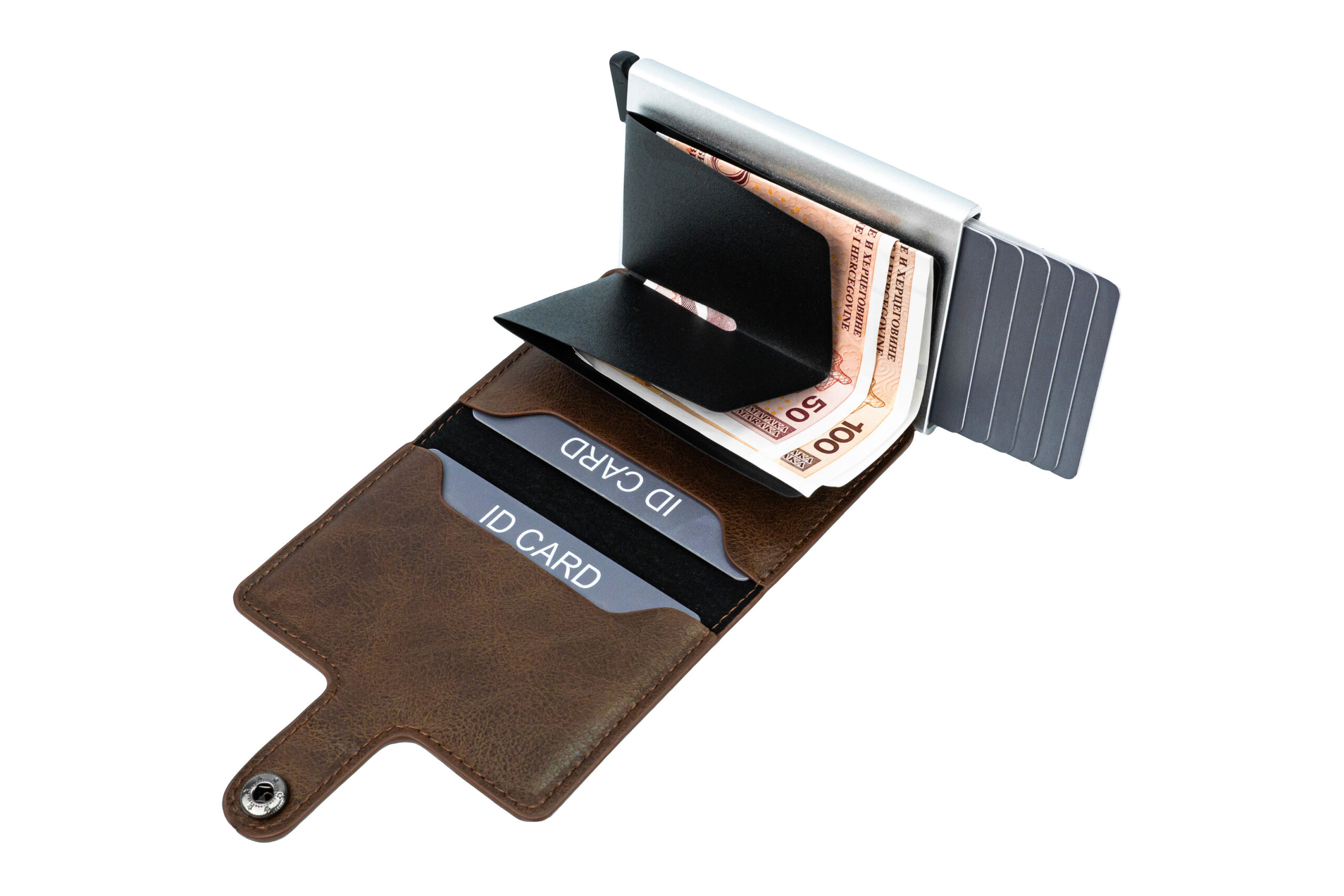Materijal: PU koža Kapacitet: 8 kartica, gotovina Dimenzije: 10x7x2 cm RFID sigurnosna zaštita