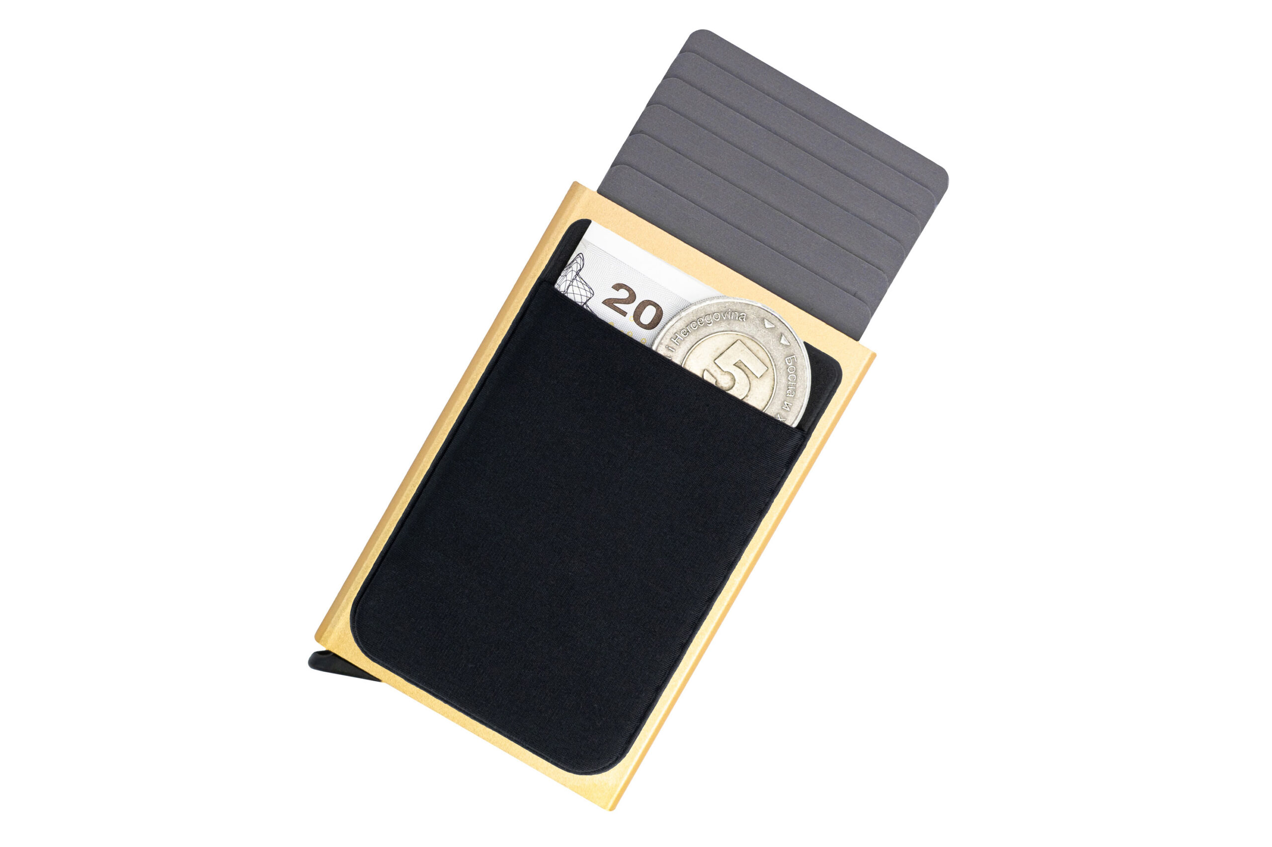 Materijal: aluminij Kapacitet: 6 kartica, gotovina, kovanice Dimenzije: 10×6.2×1 cm RFID sigurnosna zaštita
